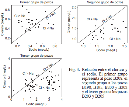 La relación establecida entre los iones Cl. y Na. reveló que en el primer grupo de pozos estudiados el mayor número de observaciones se localiza encima de la línea 1:1, lo cual infiere concentraciones de Cl. superiores al Na.. En el resto ocurrió lo inverso (Fig. 4), cuando las concentraciones de Na. son superiores al Cl. se asocia a la influencia de procesos antrópicos sobre la calidad del agua (Giussani et al. 2008, Omo-Irabor et al. 2008, Jha et al. 2009).