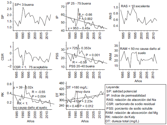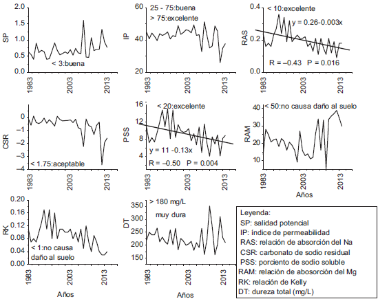 La evaluación de la calidad del agua para riego en el grupo uno (pozo B208) reveló que el agua reúne todos los requisitos para usarse en el riego agrícola. La RAS disminuyó significativamente en la etapa evaluada (Fig. 5), algo similar sucedió con los valores del PSS. Este pozo registró las concentraciones más bajas de los componentes mayoritarios y de la CE (p ≤ 0.05) (Cuadro III). El promedio de la CE clasificó el agua como de salinidad media, según el criterio usado y de buena calidad para el riego. Sin embargo, fue muy dura, lo cual puede interferir en el tiempo de vida de los sistemas de riego.