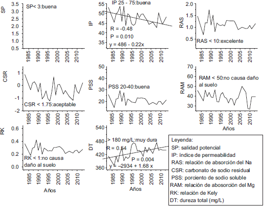 Se observó una tendencia negativa en el IP, com- binado con un incremento de la DT en el segundo y tercer grupo de pozos estudiados, lo que alerta sobre la posible afectación de la calidad del agua para el riego. Este deterioro fue más pronunciado en el tercer grupo donde el contenido de sales fue superior al resto.