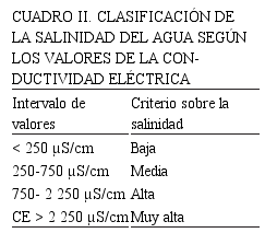 Para clasificar el agua según su contenido salino se usó el criterio de Arslan y Demir (2013) (Cuadro II).