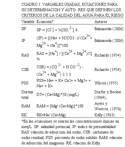 La aptitud del agua para el riego se determinó mediante las variables de mayor uso internacional y según los criterios de los autores que definieron dichas variables (Cuadro I). En el procesamiento estadístico así como en la construcción de las figuras para representar las relaciones iónicas se usaron las medias anuales de las variables correspondientes en cada grupo jerárquico. Los análisis estadísticos se realizaron con el paquete estadístico SPSS versión 15.