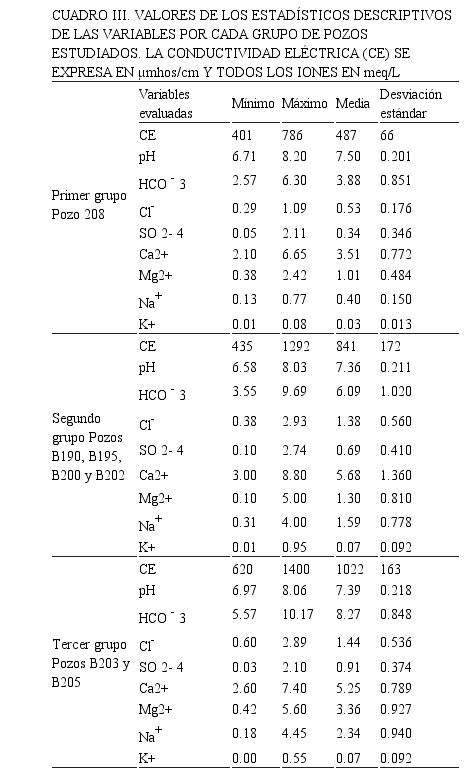 Los estadísticos descriptivos de los componentes mayoritarios del agua en cada uno de los grupos obtenidos mediante el dendograma revelaron que de forma general los valores más altos de los componentes mayoritarios y de la CE correspondieron a los pozos incluidos en el tercer grupo (B203 y B205) (Cuadro III). Se encontró diferencia significativa (p ≤ 0.05) al comparar la CE y las proporciones de los iones de los tres grupos de pozos. Excepto las proporciones de los iones SO 2– y K., que fueron similares (p > 0.5). La CE fue más alta en el tercer grupo, seguido del segundo, mientras que el primero registró los valores mas bajos (p<0.05).