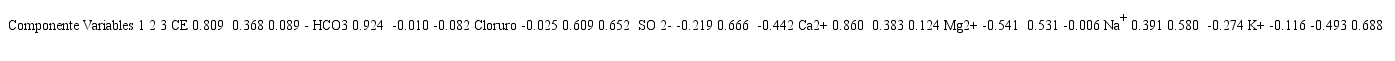 En el segundo grupo de pozos se extrajeron tres componentes que explicaron el 72.8 % de la varianza de los datos, cada factor encontrado tuvo un peso similar (24.7 %, 21.5 % y 21.5 %) (Cuadro V).