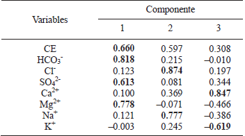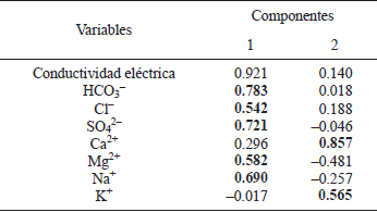 El primer factor explicó el 24.7 % y agrupó a la CE y los iones HCO ., SO 2– y Mg2+, que según la geología descrita, se encuentran presentes en las cuencas de alimentación de estos pozos. Este factor se identificó como el aporte de la meteorización de la roca.