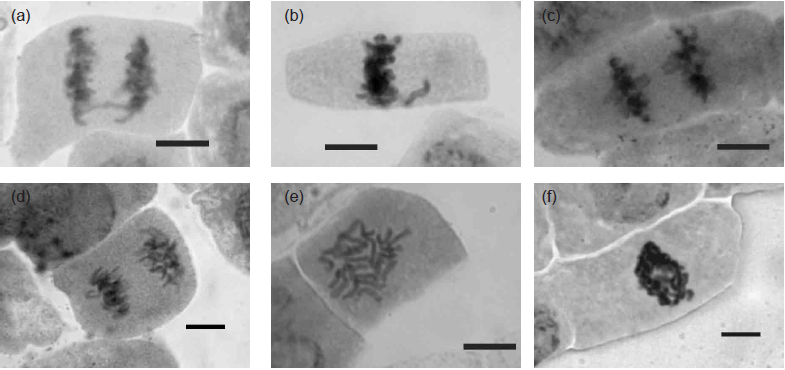 Two hundred cells in anaphase-telophase per plant were observed, and the different chromosomal aberrations in anaphase-telophase (CAAT), including bridges, fragments, vagrants and laggards, were scored. Data were expressed as a percentage of each type of CAAT/200 anaphase-telophases per plant and in terms of the average ± SE for each treatment.