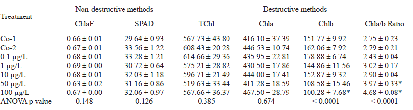 Co-1: Hoagland solution, Co-2: Hoagland solution + 0.004 % of dimethyl sulfoxide, ChlaF: chlorophyll a fluorescence measured by Fv/Fm, SPAD: total chlorophyll measured by SPAD units, TChl: total chlorophyll measured by chemical extraction with N,N dimethylformamide, Chla: chlorophyll a, Chlb: chlorophyll b, Chla/b ratio: chlorophyll a divided chlorophyll b.