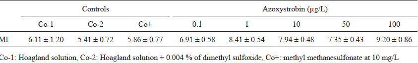Stock solutions of pure AZX were prepared in DMSO in a concentration of 2000 mg/L. AZX treatments were prepared by diluting the corresponding volume of stock solution in Hoagland medium to a final volume of 350 mL. Thereby, the five final exposure solutions of AZX contained 0.1, 1, 10, 50 and 100 µg/L of active ingredient and 0.004 % of DMSO. In addition, the following control exposure solutions were used: one negative control (Co-1), with Hoagland Solution; another negative control (Co-2) in which DMSO was added to the Hoagland solution at 0.004 % (similar to the concentration of DMSO used for the AZX exposures); and one positive mutagenic control (Co+) consisting of 10 mg/L of MMS in Hoagland solution, used only in the cytogenetic analysis.