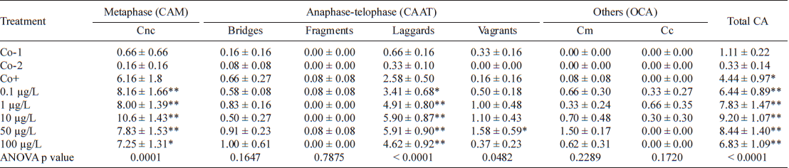 Co-1: Hoagland solution, Co-2: Hoagland solution + 0.004 % of dimethyl sulfoxide, Co+: methyl methanesulfonate at 10 mg/L, CAM: chromosome aberrations in metaphase,CAAT: chromosome aberrations in anaphase-telophase, OCA: other chromosomal aberrations, Cnc: chromosomes not congregated in metaphase, Cm: colchicine mitosis,Cc: chromosome clumping, Total CA: total chromosomal aberrations