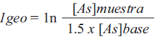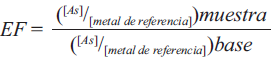 El estándar de calidad de As para sedimentos en ambiente marino (sediment quality guidelines, SQG.) establece, según el método de su efecto de rango bajo (effect range low, ERL), una concentración admisible de 8.2 mg/kg, y por su efecto de rango medio (effect range medium, ERM. un máximo de 70 mg/ kg (Fang y Chen 2015, Cagnin et al. 2017, Han et al. 2017). Para establecer categorías de contaminación en ecosistemas acuáticos se ha utilizado el índice de geoacumulación (Igeo), con el fin de categorizar el grado de contaminación de los sedimentos desde no contaminado hasta fuertemente contaminado (en escala 0-4) (Han et al. 2017). Asimismo, para estimar el riesgo ambiental y distinguir entre origen natural o antrópico de los sedimentos marinos en superficie se determina el factor de enriquecimiento (enrichment factor, EF), que puede alcanzar un grado de enriquecimiento extremadamente severo. Este indicador relaciona las concentraciones del contaminante referido con otro elemento traza normalizador asociado a la litología (Al, Fe, Cu) en la muestra y su basal (Cagnin et al. 2017).
