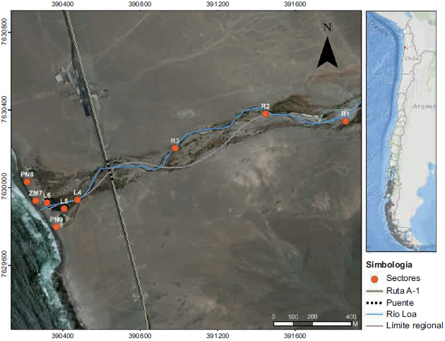 Las campañas de muestreo se realizaron en noviembre de 2015. Se tomaron muestras de sedimentos y aguas en nueve sitios desde la zona de apertura de la Cordillera de la Costa hasta su desembocadura en el océano Pacífico (Fig. 1). El diseño de muestreo consideró tres sitios en el cauce final del río (R1, R2 y R3), sistema lótico de aproximadamente 500 m de largo hasta el puente de la ruta A1; tres sitios en la laguna somera permanente (L4, L5 y L6), un sistema léntico pero con hidrodinámica superficial del desagüe del río, y un sitio en la zona de mezcla (ZM7) de la plataforma litoral que forma el humedal costero (4200 m.) a 1.5 msnm. Los cuerpos de agua son muy someros (20-40 cm de profundidad) y por sus propiedades biológicas, químicas y físicas dan cuenta de un humedal estuarino (Guerra 2005). En la bahía de la costa, arenosa y rocosa, se seleccionó un sitio (PN8) en la parte norte, caracterizada por una playa de arena con alta pendiente y fuerte oleaje, y otro (PN9) en el sector de la costa sur, caracterizada por una zona de cantos rodados de intermareal rocoso. Las muestras de agua se recolectaron en envases de polietileno y las del sedimento superficial (0-10 cm), de aproximadamente 2 kg, se tomaron con un core de PVC y se transfirieron a bolsas plásticas herméticamente selladas. En cada sitio se recolectaron tres réplicas de las muestras.
