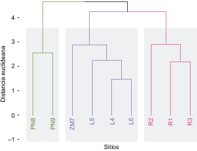 La figura 3muestra el análisis de agrupamiento mediante el índice de similitud de distancia euclidiana (Magurran 1988) entre los ambientes definidos, demostrando que las playas aledañas al norte y sur de la desembocadura tienen un comportamiento similar. En cambio, en el cauce del río existe semejanza entre áreas de mayor pendiente y escorrentía (R1 y R3). En la laguna del humedal y la zona de mezcla dicho índice muestra mayor distancia respecto de los otros sitios debido a la cercanía y dinámica propia del sistema fluvial y el oleaje. También podemos observar similitud entre los sitios L4 y L6, pero no con L5, lo cual se atribuye a la morfometría de la laguna, que en el centro posee la mayor profundidad.