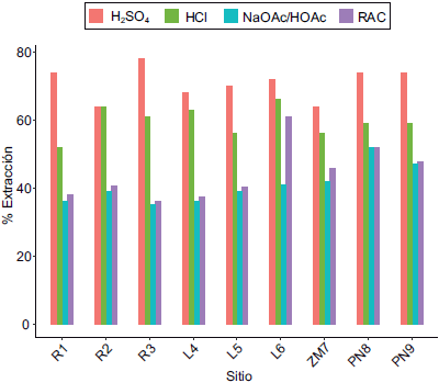 Los resultados de la efectividad en la extracción simple de As, referida funcional (disponible, biodisponible) u operacionalmente (soluble en medio ácido), manifiestan un riesgo ambiental específico, ya que modifican las propiedades ácido-básicas de los ecosistemas. Así, se obtuvieron de 50 a 74 % de extracción de As desde el medio marino y de 25 a 70 % desde el humedal (Fig. 4). En todos los sitios, la mayor efectividad (la cual fue similar) se obtuvo con ácido sulfúrico 0.25 M, pero los porcentajes de extracción con ácido clorhídrico 1M y amortiguador de acetato también lo ubican como biodisponible para organismos. Es relevante mencionar que ocurre un aumento en los porcentajes de extracción de As con el buffer acetato en los sedimentos de playas, el cual puede atribuirse a su asociación con minerales de fosfato de calcio que pueden ser redisueltos por intercambio iónico. Excepto en los sedimentos marinos, la concentración de As extraída (soluble en ácido) sobrepasa la sugerida por el ERM (70 mg/kg).