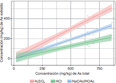 La concentración del As extraído tiene una buena relación lineal positiva con su concentración total en sedimentos (Fig. 5). Este comportamiento era esperable debido a los fenómenos de acumulación del metaloide; en consecuencia, su movilidad desde el sedimento hasta el agua es mayor si el caudal normal disminuye o por un aumento en la tasa de evaporación. Un aumento en la pendiente de las curvas se debe probablemente a la agresividad del reactivo y una destrucción mayor de la matriz.