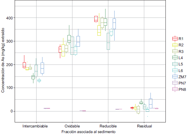 Los resultados de las concentraciones de As asociado a cada fracción del esquema armonizado por la BCR y modificado, se muestran en un diagrama de caja y bigote en la figura 6. El humedal costero tiene un comportamiento prácticamente similar: As se encuentran equitativamente distribuido entre las fracciones reducible, orgánica e intercambiable, sobrepasando hasta cinco veces el valor del ERM. La concentración obtenida en la fracción intercambiable es la más dañina para los organismos acuáticos (Wang et al. 2016); en cambio, en el borde costero el As se encuentra mayoritariamente en la fase intercambiable y residual, sobrepasando levemente el valor del REL, por lo que su riesgo potencial para el ambiente marino es discutible.