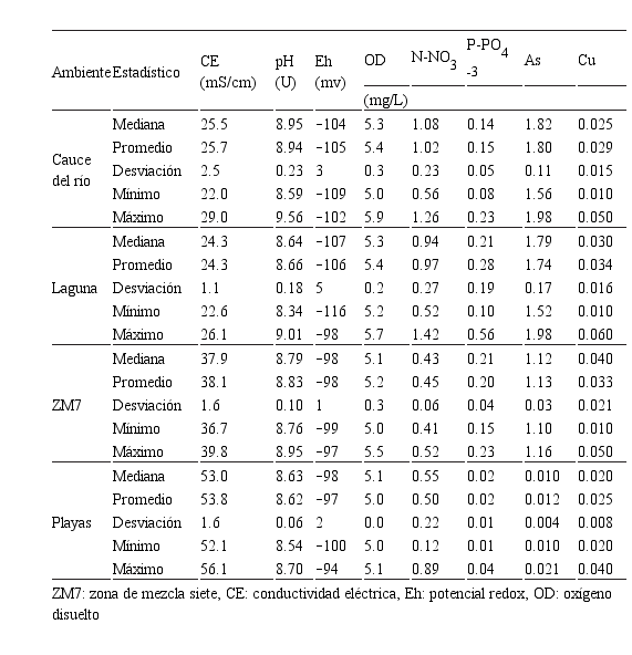 El cuadro I resume los valores para los estadísticos básicos obtenidos de los parámetros fisicos y químicos en las aguas. Los valores de CE, relativamente altos para ríos (26 mS/cm), permiten comprobar que las aguas y la laguna son saladas (10-100 mS/cm). Como era de esperarse, se observa un aumento de la salinidad en la zona de mezcla y un valor habitual de CE del océano Pacífico en las muestras de agua de mar. Las aguas continentales y marinas presentan condiciones de levemente alcalinas a alcalinas, producidas por el equilibrio entre carbonatos y bicarbonatos, aunque contribuyen también en ambientes áridos los contenidos de boratos y silicatos. El intervalo de pH es de relevancia en varios fenómenos físicos, químicos y biológicos tales como reacciones redox, procesos de sorción y reacciones de solubilización-precipitación de iones en disolución. Bugueño et al. (2014), de acuerdo con los resultados, mostraron un gradiente positivo de salinidad y alcalinización de las aguas desde la parte alta de la cuenca del río Loa hasta la parte baja.