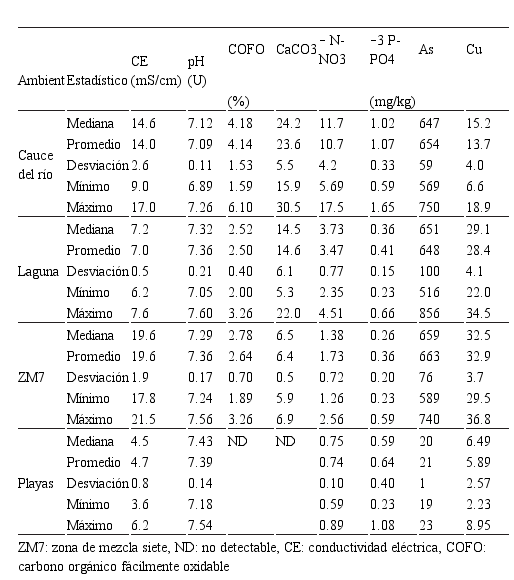 Los sedimentos continentales neutros muestran un gradiente longitudinal del contenido de materia orgánica fácilmente oxidable, desde el río hasta la zona de mezcla en la laguna. Hay conductas similares entre las concentraciones de nitrato y fosfato disponibles, e importantes contenidos de carbonato de calcio (alrededor de 15 %). Las concentraciones de Cu son normales tanto en los ambientes terrestres como en el mar, pero las de As en los sedimentos del humedal costero son muy elevadas (640 a 800 mg/kg) y en los sedimentos de playa alcanzaron 20 mg/kg. Los valores del Igeo de As confirman la categoría de contaminación terrestre, pero no marina; sin embargo, los niveles de los factores de enriquecimiento confirman la extensión de un riesgo ambiental potencial en toda la desembocadura.