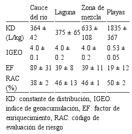 Los niveles alcanzados para el código de evaluación de riesgo (Cuadro II . Fig. 4) son coincidentes, y establecen que el riesgo en el medio marino (50 ± 2 %) es muy elevado, mientras que en la laguna (46 ± 13%), en la zona de mezcla (46 ± 1%) y en el cauce final del río (38 ± 2 %) es elevado (Wang et al. 2016). Independientemente de la concentración total de As, los resultados muestran una importante biodisponibilidad de este elemento para los organismos del humedal y el medio marino, cuyos hábitos tróficos dependen de las partículas depositadas en el fondo, que además pueden removilizarse a la columna de agua y elevar el riesgo biológico. El riesgo es potencial basado en una metodología práctica, pero que no considera la realidad en términos de fuerza iónica y actividad protónica.