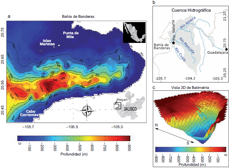 El área de estudio (Fig. 1a) es Bahía de Banderas, que se localiza en la costa occidental de México y constituye el límite sur del Golfo de California en su parte continental, abarcando parte de los estados de Jalisco y Nayarit. Geográficamente, la bahía está ubicada entre los 20º25’ y 20º47’ de latitud norte y los 105º41’ y 105º25’ de longitud oeste.
