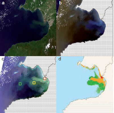 Las observaciones del color del océano tienen gran potencial para estudiar la conectividad entre litorales y zonas costeras mediante el rastreo de la dispersión de las plumas vertidas por los ríos. La identificación de estas plumas, las variaciones en su extensión, patrones de dispersión y tasas de mezcla con aguas oceánicas es crítica en todos los aspectos de la oceanografía regional y de la plataforma continental (Lohrenz et al. 1990).