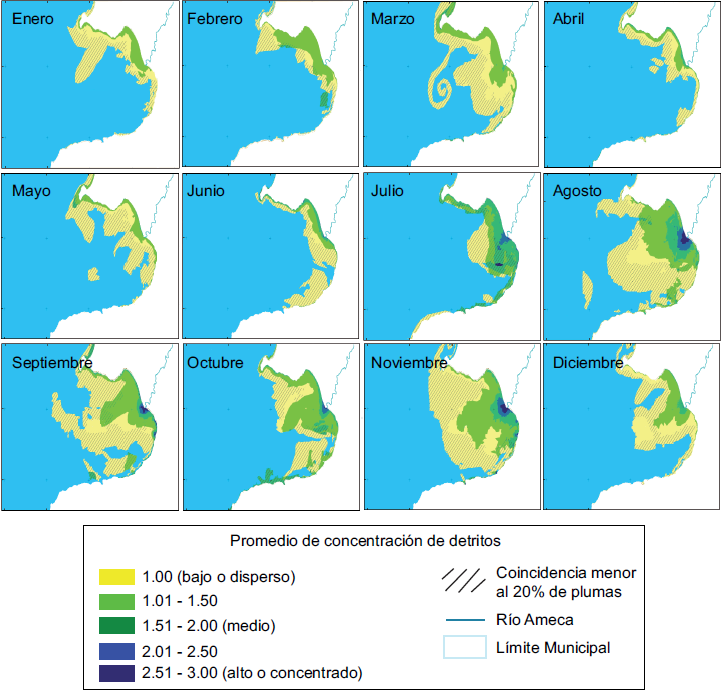 Se puede observar que en los meses de diciembre a mayo el caudal del río Ameca (a causa de la ausencia de lluvia) es pequeño, lo que se refleja en una densidad preponderantemente media y baja de las plumas de detritos. En este periodo de seis meses, la pluma bordea la costa hacia el norte y su dispersión hacia el centro de la bahía tampoco es muy alta (Fig. 3).