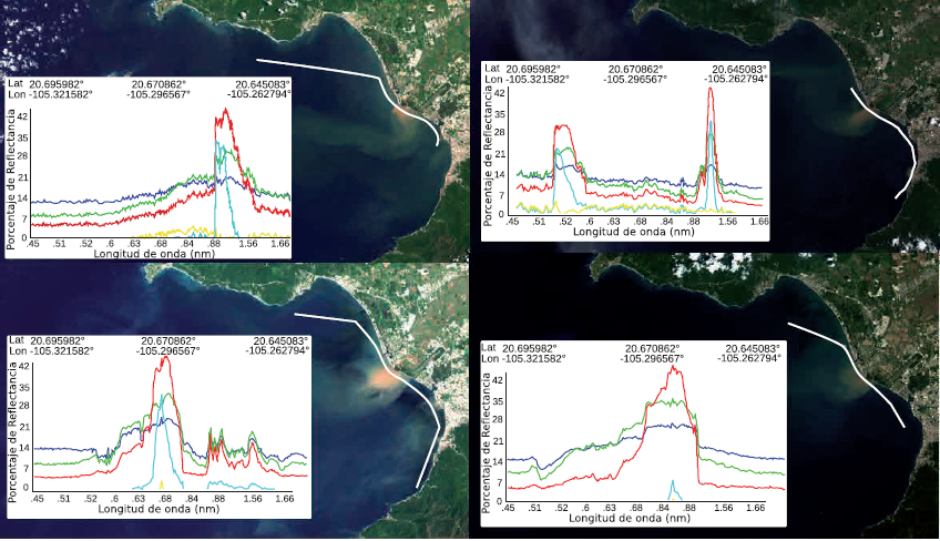 Para analizar la respuesta espectral de la pluma de detritos se realizaron transectos cerca de la línea costera (Fig. 4) en cuatro escenas obtenidas con el sensor Landsat 8, y los espectros obtenidos se compararon con las firmas espectrales de la clorofila, algas, materia orgánica y agua turbia.