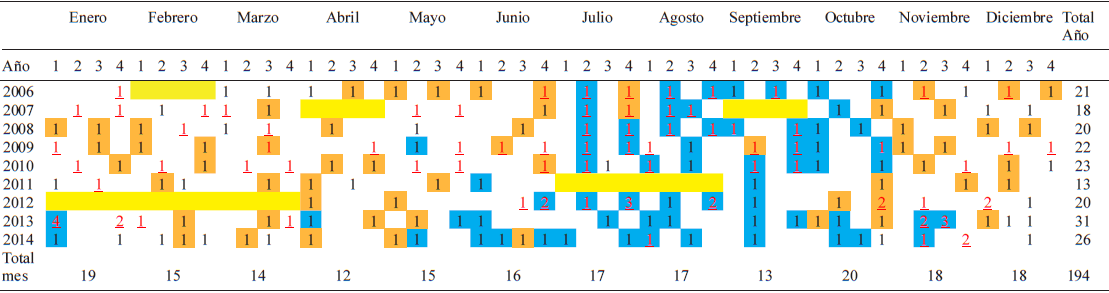 Después de clasificar las plumas respecto a su nivel de concentración parametrizada de detritos, se procedió a determinar el promedio mensual del periodo 2006-2014, así como la superficie promedio que ocupan por mes (Fig. 3). Ya que en algunos meses presentan una diferencia muy marcada entre sus plu- mas de detritos, se señala con un código de color en líneas negras la zona donde la coincidencia es menor al 20 % de plumas, la cual se ve reflejada en plumas de categoría 1; esto con la intención de establecer una zona más pequeña con un nivel de coincidencia del 80 %, lo que resulta ser una marca mucho más representativa del periodo de tiempo analizado.