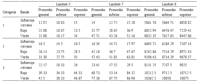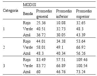 Una vez procesadas el 100 % de las escenas se calcularon las estadísticas del comportamiento espectral de cada categoría. Ya que las escenas corresponden a diferentes días y todas contaban con diferente cantidad de nubosidad, se determinaron los límites de cada categoría tomando en cuenta el límite inferior y superior de su respuesta espectral, estableciéndose a su vez un promedio central en base a esos límites (Cuadro IIpara Modis y Cuadro III para Landsat).