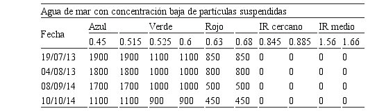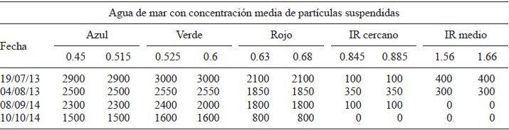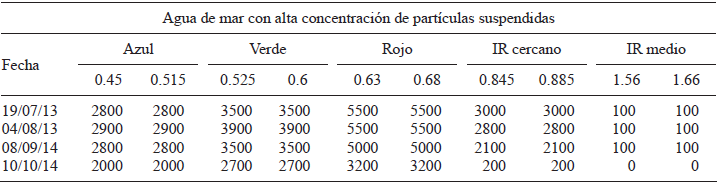 Aunque cada escena cuenta con 10 bandas, sólo se trabajaron para este análisis las correspondientes al espectro visible (banda 2, 3 y 4) y al infrarrojo cercano e infrarrojo medio (bandas 5 y 6, respectivamente) debido a que estas bandas muestran la mayor respuesta de los sedimentos suspendidos detectados en las imágenes, coincidiendo también con las bandas empleadas para la detección de clorofila, sedimentos y materia orgánica (cuadros IV a VII). Los cuadros muestran que el valor de la firma espectral sobre el agua de mar con concentración de categoría 2 tiene mayor reflectividad en el verde, seguido por el azul y el rojo. Sin embargo, aunque el verde y el azul predominan, se observa que el rojo tiene un crecimiento más marcado conforme aumenta la concentración de partículas suspendidas. Se puede observar también que la reflectividad del infrarrojo cercano e infrarrojo medio empiezan a incrementarse aunque de forma muy lenta, lo que implica la transición a agua turbia. En lo referente a concentraciones correspondientes a la categoría 3 se observa que la mayor respuesta espectral ocurre en el rojo, seguido por el verde, infrarrojo cercano, azul y, finalmente, infrarrojo medio.