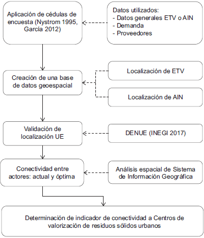 Con base en la información del Directorio Estadístico Nacional de Unidades Económicas (DENUE) del Instituto Nacional de Geografía y Estadística (INEGI 2017), así como del “Plan para el manejo, aprovechamiento y valorización de los RSU en el Estado de México” (CMM 2015), se presenta una propuesta metodológica basada en conceptos básicos del análisis espacial, los cuales describen la relación funcional entre los AIN y las ETV en el Estado de México.