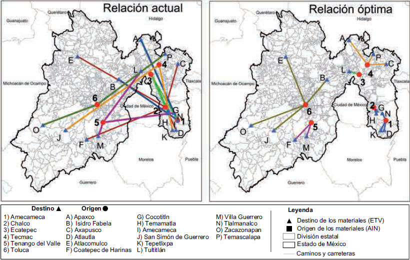 En la figura 3 se muestra la relación actual y óptima entre las seis ETV del cuadro II (señaladas con un círculo) y los 16 AIN asociados a éstas (marcadas con un triángulo). La relación actual entre AIN y ETV se analiza a partir de los resultados de la encuesta. Asimismo, la relación óptima se establece con base en la distancia mínima entre instalaciones origen-destino. Para dicho efecto, se determinaron 16 rutas, utilizando la herramienta Network Analysis de QGIS.