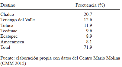 Las ETV que constituyen los destinos más frecuentes se ubican en los municipios de Chalco y Tenango del Valle, una al este y la otra al oeste del estado, respectivamente. En contraste, las ETV ubicadas en la capital del estado ocupan el tercer lugar como destino más frecuente. En conjunto, los seis destinos más frecuentes representan casi el 72 % del total de destinos más frecuentes a donde se envían los materiales valorizables de los RSU del Estado de México.