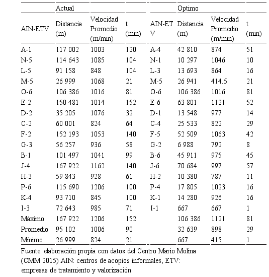En los resultados presentados en el cuadro II se pueden observar variaciones considerables en las distancias de transporte para la relación actual. Dicha relación genera rutas que van desde los 26.9 a los 167.9 km. Estas distancias inciden directamente en los precios de compra y venta de los subproductos, rubros en que los AIN se ubican en la posición más baja de la cadena de valor. Debido a lo anterior, son los AIN los que deben absorber los costos de transporte mediante variaciones de precios de los materiales recuperados. Asimismo, el promedio del indicador de conectividad t para ambos escenarios varía de manera importante, siendo de 90 min para la relación actual y de 29 min para la relación óptima.