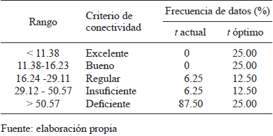 Los rangos y criterios de conectividad de cada grupo (percentiles) utilizados en este análisis se 0presentan en el cuadro III, donde también se puede observar que el 87.50 % de las rutas actuales presenta un criterio de conectividad deficiente, con valores por encima de los 50.57 min de transporte. Sólo el 6.25 % de las rutas de la relación actual presenta un valor de conectividad regular y el otro 6.25 %, un valor insuficiente.
