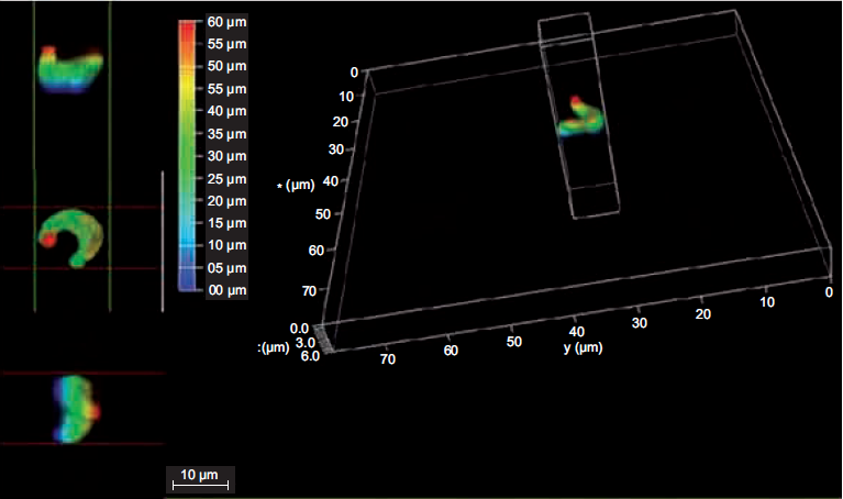 Figure 2shows the three-dimensional structure of the P. subcapitata cell in a 3D confocal microscopy image with the following measurements: 8 μm on the . and . axes, and 6 μm in the . axis (depth), where it is observed in different colorations.
