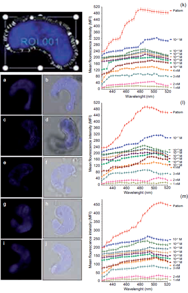 Regarding the orange fluorescence in the microalgal cell P. subcapitata at different concentra- tions of QD nanoparticles, the mean intensity of fluorescence (MIF) decreases with the following values: 10–1 M, MIF = 325; 10–2 M, MIF = 254; 10–3 M, MIF = 241; 10–4 M, MIF = 233; 10–5 M, MIF = 221; 10–6 M, MIF =2 02; 10–7 M, MIF = 184; 4 nM, MIF= 140; 3 nM, MIF = 97; 2 nM MIF = 48, and 1 nM, MIF = 21 (Fig. 3k).