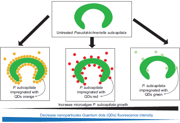 Reference toxins such as QD nanoparticles ad- hered to the P. subcapitata microalgae exhibit different fluorescence such as orange, red and green when they are exposed to the ultraviolet light observed in the standard solution (4M) of QDs and 10–1 M. The green fluorescence was not observed at the 10–1 M concentration alone (Fig. 1).