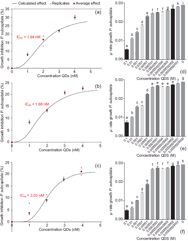 The exposure of P. subcapitata to different concentrations (0, 1, 2, 3, and 4 nM) of QD nanoparticles caused an IC50 in the microalgae of 1.94 nM of QDs with orange fluorescence, of 1.68 nM with red fluo- rescence and of 2.03 nM of with green fluorescence at 96 h of exposure (Fig. 4a, b, c).