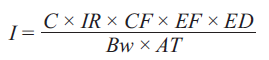 La ingesta (I), se determinó utilizando la ecuación genérica para el cálculo de la exposición, expresada a menudo como un consumo diario promedio basado en el peso corporal (unidades de miligramos por kilogramo de peso corporal por día [mg/kg × día]). La ecuación genérica fue la siguiente (USEPA 2005):