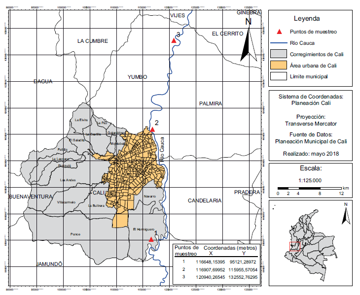 Las poblaciones fueron seleccionadas por su cercanía con el mayor centro poblado del suroccidente colombiano (la ciudad de Cali), el antiguo vertedero de residuos sólidos a cielo abierto de Navarro y el mayor centro industrial de esta zona del país (el municipio de Yumbo). De acuerdo con las personerías (entidades de servicio público que vigilan y hacen control sobre la gestión de las alcaldías y entes descentralizados) del municipio de Cali y del departamento del Cauca, esta zona ha evidenciado un incremento de la minería ilegal, particularmente en la zona del Parque Nacional Natural los Farallones de Cali y el norte del departamento del Cauca, con la consecuente contaminación con mercurio de fuentes hídricas como los ríos Cali y Meléndez en la ciudad de Cali y de los ríos Ovejas, Teta y Quinamayó en el norte del departamento del Cauca, todos tributarios del río Cauca. En ese sentido, se configuraron tres zonas de estudio: 1) Corregimiento el Hormiguero, el cual se encuentra localizado al sur de la ciudad de Cali, a 16 km de la zona urbana de la ciudad y a 5 km de Navarro; 2) Jarillón del río Cauca, Comuna 6, un dique que se encuentra ubicado en la ciudad de Cali sobre la margen izquierda del río Cauca a 10 km del vertedero de Navarro; 3) vereda Paso de la Torre, localizada hacia el norte, a 4.5 km de la ciudad de Yumbo. Las tres zonas se caracterizan por tener población con bajos ingresos económicos, un nivel educativo entre primaria y secundaria y por su consumo permanente de pescado proveniente del río Cauca (Echeverry et al. 2015, Figueroa et al. 2017). La figura 1muestras la zona de estudio.