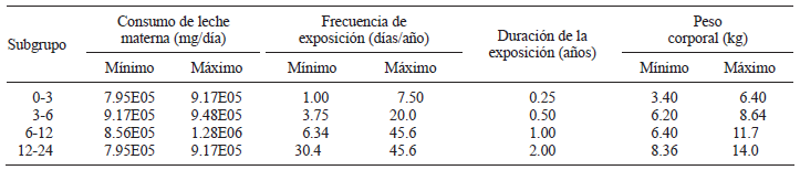 La encuesta para obtener información nutricional de las madres fue adaptada culturalmente a la población de este estudio. Para la evaluación de riesgo, los niños se dividieron en subgrupos debido a los cambios drásticos que experimentan los bebés en variables como el peso corporal y el consumo de leche materna. En el cuadro I se presentan el intervalo de edad en meses de cada subgrupo y los valores de los parámetros: consumo de leche materna, frecuencia de exposición, duración de la exposición y peso corporal. Todas las unidades son las requeridas en el modelo USEPA.