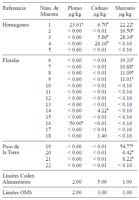 Los niveles más altos de mercurio y plomo en las muestras de leche analizadas están por encima de 1.0 y 2.0 μg/kg, que son los límites máximos recomendados por la OMS para estos metales (Hermoza y Lomparte 2006). Los niveles de plomo y mercurio superan la norma de la OMS, hasta 21 y 20 veces, respectivamente. Para el cadmio, la Comisión del Codex Alimentarius de la Unión Europea estableció en la revisión de mayo de 2014 un contenido máximo en preparados lácteos para niños lactantes de 5 μg/kg, por lo que las muestras 14 y 18 tomadas en Jarillón de Floralia en la comuna 6 de Cali, cumplen con el límite máximo establecido en esta norma europea. Las muestras del corregimiento El Hormiguero, que contienen las mayores concentraciones de cadmio, sobrepasan este valor hasta en un 523 %. Estos resultados constituyen la primera evidencia del contenido de cadmio, mercurio y plomo en leche materna de madres residentes en la zona de estudio. La concentración de metales pesados en las muestras restantes está por debajo del límite de cuantificación y cumple con los límites máximos permitidos por la norma de la OMS y la Comisión del Codex Alimentarius.