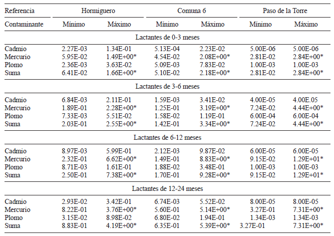 El cálculo del riesgo por sustancia de efectos tóxicos no carcinogénicos se realizó por el cociente del valor de la ingesta calculada con una dosis de referencia específica . Si se considera que existe un riesgo para la salud inaceptable y habrá que tomar medidas correctivas (USEPA 2005). Los valores de la dosis de referencia (RfD) para cadmio, metil mercurio y plomo fueron 1.00 × 10–3, 1.00 × 10–4 y 3.57 × 10–3 mg/kg × día, respectivamente.