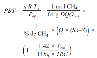(2)donde n es el número de moles del gas (1 mol CH4), R la constante universal de los gases ideales (0.082057 atm L/mol K), Top la temperatura de operación (K), Pop la presión atmosférica de operación (0.74 atm), Q el flujo (L/d), So la DQOs del influente (mg/L), S la DQOs del efluente (mg/L), Yexp el rendimiento celular experimental (0.11 mg SSV/mg DQOrem, valor obtenido en esta investigación), bH el coeficiente de decaimiento endógeno (0.03 1/d, Tchobanoglous et al. 2014) y TRC el tiempo de retención celular (81 y 95 días para las etapas experimentales I y II, respectivamente).