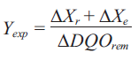(4)donde ∆Xr es la masa total del lodo acumulado en el interior del reactor durante el periodo de tiempo entre dos cuantificaciones de biomasa del reactor (kg SSV), ∆Xe la masa total del lodo perdido en el efluente durante el periodo de tiempo entre dos cuantificaciones de Xr (kg SSV) y ∆DQOrem la masa total del DQOs removida (kg DQOs rem) durante el periodo de tiempo entre dos cuantificaciones de Xr.
