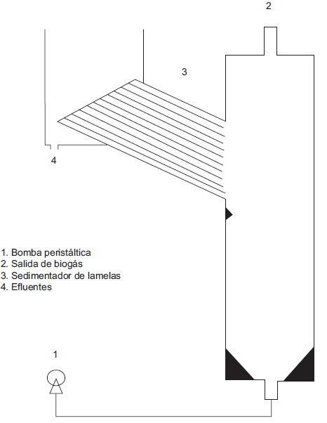 El reactor UASB se construyó a escala de labora- torio con acrílico trasparente de un espesor de 0.8 cm y un volumen de 4.5 L (10 × 10 × 45.5 cm). La parte inferior interna del reactor fue cónica para tener una distribución uniforme del influente. En la salida del reactor se instaló un sedimentador de lamelas para ayudar a la retención de sólidos suspendidos dentro del reactor. El reactor fue alimentado con una bomba peristáltica (marca Cole Palmer, modelo Masterflex, EUA) para mantener el flujo constante y continuo durante las dos etapas experimentales (Fig. 1).