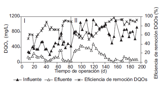 La ER del reactor UASB se evaluó durante las dos etapas experimentales (Fig. 2). La ER durante toda la etapa experimental I fue variable, mientras que en la etapa experimental II se incrementó con el paso del tiempo de operación del reactor UASB, independientemente de la fluctuación de la DQOs del influente.