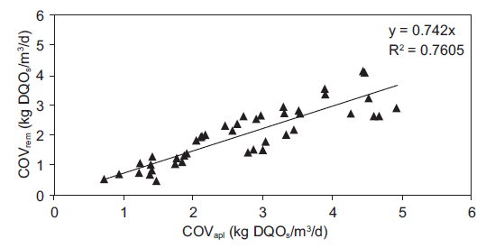 La COVrem aumentó cuando la COVapl se incrementó. La pendiente de la correlación lineal indicó el porcentaje de ER global de las dos etapas experimentales. La ER global mostrada en la figura 3(74 %) fue igual a la calculada con la DQOs del influente y efluente y cercana al valor teórico de van Haandel et al. (2006) (80 %).
