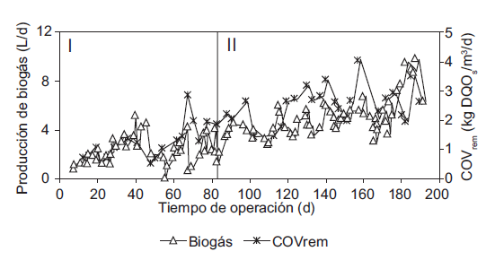 La PB y la COVrem durante ambas etapas experimentales se muestran en la figura 4. En general se observa que la PB se incrementó conforme la COVrem aumentó. Los días 48 y 68 de operación se presentaron dos disminuciones de la PB debido a problemas operativos. La PBSTD promedio de las etapas experimentales I y II fue de 1.6 L/d (0.3 Lbiogás/L/d) y 3.5 L/d (0.8 Lbiogás/L/d), respectivamente.