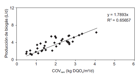 Trabajar con un solo tipo de agua residual industrial evitó posibles variaciones en la calidad del agua, la cual puede influir en el tratamiento anaerobio. Además, el lodo anaerobio del presente trabajo estaba adaptado previamente al mismo tipo de agua residual industrial y a la baja temperatura de operación. Con lo antes descrito se favoreció la ER del presente trabajo. La correlación lineal entre la COVapl y la carga orgánica volumétrica removida (COVrem) de las etapas experimentales I y II se muestran en la figura 3. El alto coeficiente de determinación (R2 = 0.7605) indica que los datos experimentales de COVapl y COVrem estuvieron relacionados entre sí.