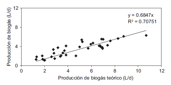 La producción de biogás teórica (PBT) se determinó para obtener una aproximación de la cantidad de biogás esperada (ecuación 2). A partir de la ecuación de la ley de los gases ideales se calculó la PBT (Esparza et al. 2013, Tchobanoglous et al. 2014).
